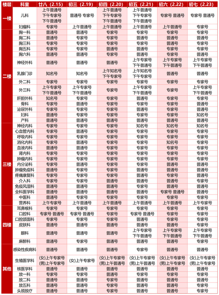 为保障春节假期的诊疗需求,2月15日(廿八)、2月19日(初三)-23日(初七),我院门诊、急诊照常运行,医疗服务“不停歇”,为您的健康保驾护航。各科室具体出诊时间、专家排班及注意事项均已详细列出,方便您随时查阅,以便高效、顺畅就诊。